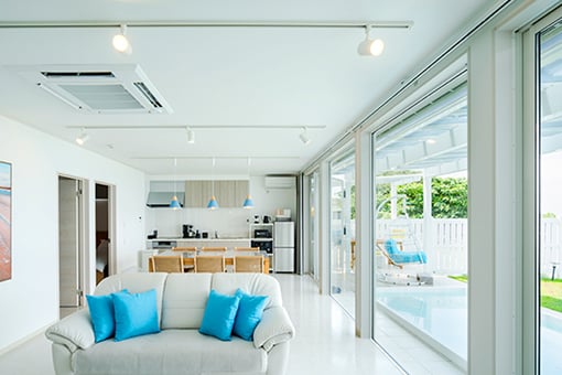 青と白を基調としたリゾート感たっぷりの室内空間。